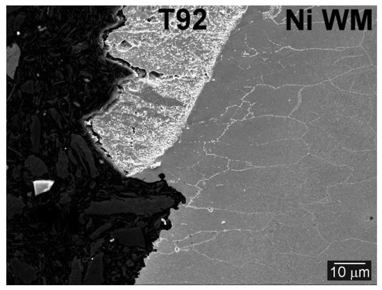The individual microstructural regions of investigated T92/TP316H dissimilar weldment, namely T92 tempered martensitic steel base material (T92 BM), Ni-based weld metal (Ni WM) Thermanit Nicro 82, and TP316H austenitic steel base material (TP316H BM) are documented in Figure 3, Figure 4, Figure 5 and Figure 6.
