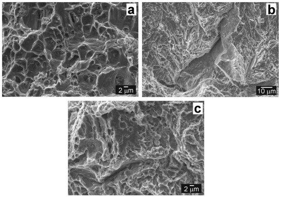 As it follows from Figure 9a and Figure 10a and Table 2, all samples of the initial QT PWHT state failed during tensile straining in the austenitic TP316H region. Figure 12a represents the fracture surface of the QT PWHT state with ductile dimple areas and some tear ridges as a result of intensive local plastic deformation. After hydrogen charging (state QT PWHT + H), the failure became brittle with the transgranular cleavage character (Figure 12b) and typical signs of hydrogen embrittlement (“fish-eye”) on the fracture surface appears (Figure 12c). As it was already mentioned in previous sections, the samples fractured mostly in the fusion zone near the T92 BM/Ni WM interface (see, e.g., Figure 10b).