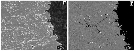 The fracture path indicates the presence of both transgranular cleavage and intergranular decohesion fracture mechanisms. Obviously, during tensile straining, the voids arose along the grain boundaries (Figure 14a). Moreover, the cracked secondary phase particles at the grain boundaries can be clearly visible. The preferential secondary phase precipitation and coarsening of the Laves phase particles on grain boundaries is considered the critical factor influencing premature failure of T92 steel in creep loading conditions [7]. In our study it has been confirmed that the highly coarsened secondary phase particles on grain boundaries are mostly the Fe2(W,Mo) Laves phase particles (see the bright appearing particles in Figure 14b). Similarly, in the microstructure just beneath the fracture surface of Ni WM, the cracked NbC particles and voids formation were observed (Figure 15). Thus, the major mechanism of the plastic properties degradation by hydrogen can be related to the microvoid coalescence, secondary phase particles cracking and final decohesion at matrix/particles interfaces or grain boundaries.