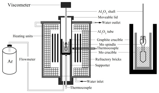 The experimental apparatus (RTW-10, Northeastern University, Shenyang, China) for viscosity measurement, as shown in Figure 1, mainly consists of a viscometer, heating units, water cooling, and a gas system. The Mo crucible with an inner diameter of 40 mm and depth of 80 mm was selected to be the slag container. To avoid oxidation of FeO, the Mo crucible was put into a graphite crucible. High purity Ar gas (0.5 L/min) was blown into the Al2O3 tube at the beginning of the rising temperature. Before the experiment, the Mo crucible and spindle with the same sizes for slag viscosity measurement were employed to calibrate the viscometer using castor oil with known viscosities (0.986, 0.651, and 0.451 Pa·s) at different room temperatures. A certain amount of castor oil filled the Mo crucible with a depth of 40 mm, which is approximately equal to the depth of the slag during the viscosity measurement.