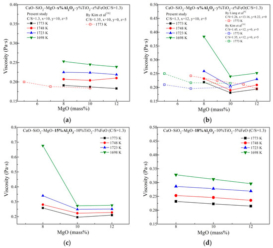 Figure 3 shows the effect of MgO content on the viscosity of the slag with different Al2O3 contents at high temperatures above 1698 K. When the Al2O3 concentration is 10% or 18%, the effect of MgO on viscosity variation is slight in the experimental MgO range. On the other hand, the viscosity significantly rises once MgO content is lower than 10% for the slag with 12% or 15% Al2O3. The trend in the slag viscosity as a function of MgO content could be regarded as a common pattern of decreasing viscosity with increasing MgO for slag composed with 10%, 15%, and 18% Al2O3, whereas the viscosity first decreases and then increases with a higher MgO for composition with 12% Al2O3. According to the viscosity results by Kim et al. [16], the viscosity of the CaO−MgO−10%Al2O3−SiO2−5%FeO (C/S = 1.35) slag slightly decreased with increasing MgO. Liang et al. [8] reported that the CaO−MgO−Al2O3−SiO2−TiO2 slag viscosity decreased as MgO content increased. These results are depicted in Figure 3a,b for comparison. It is generally suggested that the slag viscosity decreased as a result of the slag’s network structure depolymerization, facilitated by the basic behavior of MgO. However, for the composition with 12% Al2O3, the slag viscosity does not obey this well-recognized trend. The unusual viscous behavior with changing MgO (Figure 3b) will be discussed later.