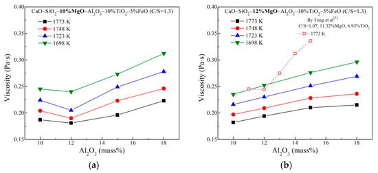 The effect of Al2O3 content on the viscosity of slag with MgO contents of 10% and 12% are shown in Figure 4. The trend of the viscosity as a function of Al2O3 content exhibited different patterns with increasing Al2O3 at the studied MgO concentrations. As noted in our previous work [13], for slag with 8 mass% MgO, the addition of Al2O3 with 10 to 15 mass% increased the viscosity, reaching a maximum, followed by a decrease at higher Al2O3 content. From Figure 4a, when the slag contains 10% MgO, by increasing Al2O3 content from 10% to 12%, the slag viscosity is reduced. Further increasing Al2O3 content to 18% tends to increase the viscosity. On the other hand, the viscosity of the slag with 12% MgO monotonically increases with increasing Al2O3 content, as shown in Figure 4b. In Feng’s study on CaO−MgO−11.32%Al2O3−SiO2−6.93%TiO2 slag, the viscosity increased with the addition of Al2O3 due to the polymerization of the slag’s network structure [3]. The present slag is highly basic because the amount of basic oxides, including FeO, CaO, and MgO, is higher than 50 mass%. In such a basic environment, Al2O3 is likely to demonstrate acid characteristic and polymerize the network structure, such that the effects of Al2O3 increase viscosity, which is also proposed by Kim et al. [17] and Song et al. [18]. In other words, the increase of viscosity after the addition of Al2O3 (shown in Figure 4) could be explained by the polymerization of the network structure caused by the acidic behavior of Al2O3. Nevertheless, the appearance of the minimum viscosity at 10% MgO and at 12% Al2O3 in Figure 4a is unusual and will be discussed later.