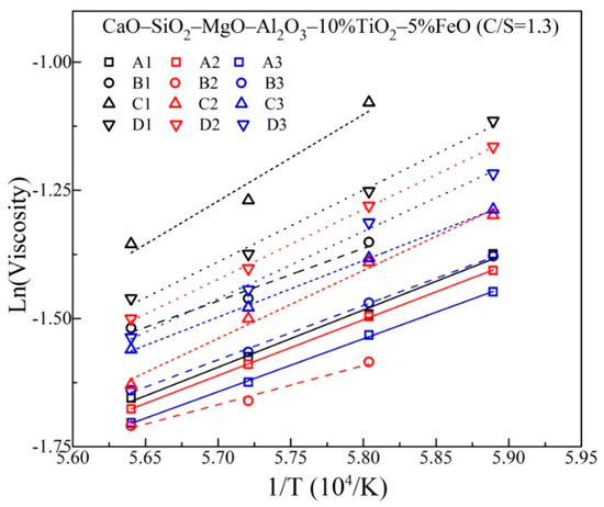 The variation of viscosity and Eη is certainly related to the change of the slag’s network structure. In the present slag, the network-forming ions include Si4+, Al3+, and Ti4+. The specific change of the network structure consisting of Si−O, Al−O, and Ti−O network should be clarified using FTIR and Raman spectroscopy to understand the roles of MgO and Al2O3.
