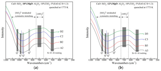 FTIR results of the slag with varying Al2O3 content, with MgO content of (a) 10 mass% and (b) 12 mass%.