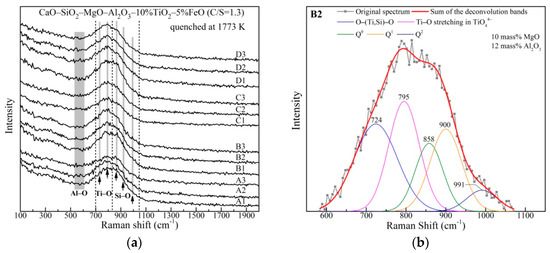The Raman and FTIR are complementary to each other because T−O (T represents Si, Al and Ti atoms) bondings may be FTIR active, Raman active, or both. For instance, the Ti−O network is unidentifiable from the FTIR results [25,26,27]. Hence, the slag network structure is further analyzed by Raman spectroscopy, and the results of the original Raman spectra are shown in Figure 8a. As can be observed, the strong Raman bands are located at the 600~1100 cm−1 ranges in the entire Raman spectra for every slag. The relative intensity between the shoulder at ~730 cm−1, the strongest peak at ~800 cm−1, the peak at ~860 cm−1, the shoulder at ~910 cm−1, and the shoulder at ~1000 cm−1 varies with changing slag compositions, where the former two are assigned to O−(Ti, Si)−O deformation vibrations in sheet units and Ti−O stretching vibrations in [TiO4]4− monomers, and the latter three are identified as silicate structural units Q0, Q1, and Q2, respectively, according to previous work [28,29,30,31,32,33,34]. The Raman bands that correspond to Al−O stretching vibrations [24,35,36] at 530~610 cm−1 do not change significantly, similar to FTIR results.