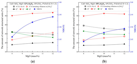 In order to illustrate the detailed change of the Si−O and Ti−O networks, the Gaussian-Deconvolution method was employed by assuming contributions from the structural units of O−(Ti, Si)−O, [TiO4]4−, Q0, Q1, and Q2 to deconvolute the Raman spectra bands between 600 and 1100 cm-1 with a minimum correlation coefficient of 0.99, similar to the method used by other researchers [17]. The assignments of the Raman shift for various structural units are listed in Table 3. A typical deconvolution of the Raman spectra is shown in Figure 8b through this approach. In this way, the area ratios of O−(Ti, Si)−O, [TiO4]4−, Q0, Q1, and Q2 can be ascertained. Based on the obtained peak area ratios and the Raman scattering coefficient of Qn, the mole fractions of Qn could be calculated by the specified equation [13,37]. Generally, the average amount of non-bridging oxygen (NBO/Si) is used to explain the Si−O network by referring to previous studies [38,39]. NBO/Si is calculated by the mole fractions of Qn multiplied by the amount of its non-bridging oxygen, where lower NBO/Si implies a more polymerized Si−O network structure. The effects of MgO and Al2O3 on O−(Ti, Si)−O, [TiO4]4− and NBO/Si can be observed in Figure 9 and Figure 10. When MgO content increases at a fixed Al2O3 concentration, the amount of O−(Ti, Si)−O decreases and the amount of [TiO4]4− increases. Meanwhile, NBO/Si trends upward by increasing MgO. On the other hand, by increasing Al2O3 content at a fixed MgO concentration, an increased amount of O−(Ti, Si)−O and a decreased amount of [TiO4]4− and lower NBO are observed with higher Al2O3 content.