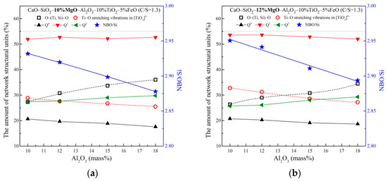 Abundance of the structural units with varying Al2O3 content at fixed MgO concentrations of (a) 10 mass% and (b) 12 mass%.