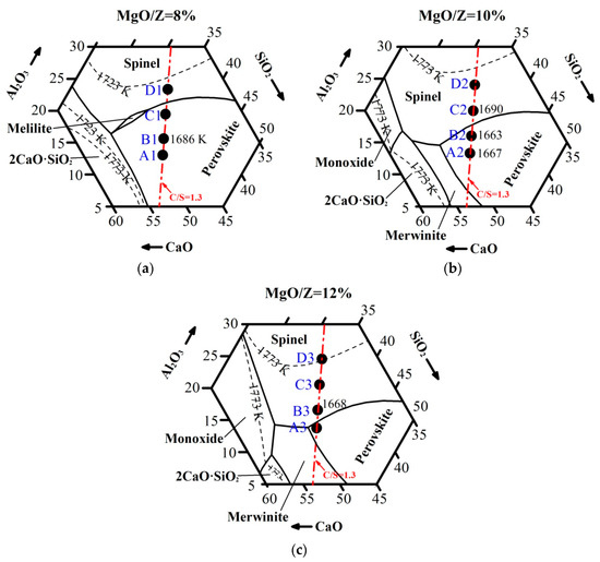 Phase diagrams of the CaO−MgO−Al2O3−SiO2−10 mass%TiO2−5 mass% FeO slag system calculated by Factsage 7.2 (TiO2/Z = 10%, FeO/Z = 5%, Z = CaO + SiO2 + MgO + Al2O3 + TiO2 + FeO, mass fraction), (a) 8 mass% MgO; (b) 10 mass% MgO; (c) 12 mass% MgO.