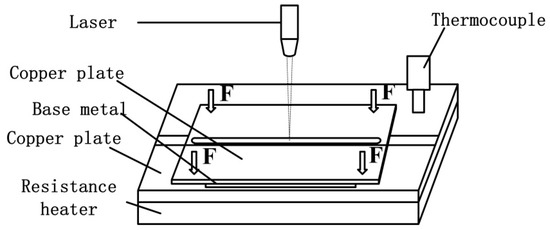 HKW-1050 pulsed laser welding equipment manufactured by New Industry Photoelectric Technology Co., Ltd, Changchun, China. was used in the experiment. The laser used in the test was an Nd: YAG solid-state laser with a pulse welding method. The protective gas was argon at the purity of 99%, the gas was added as a cross jet and the flow rate was 15 L/min. The parameters of laser welding are shown in Table 3. The laser welding parameters were consistent under different preheating conditions, ensuring that the samples were welded in keyhole model. The schematic diagram of the welding device is shown in Figure 1. Before welding, the base metal was treated by ultrasonic cleaning with acetone to remove surface dirt. During the welding experiment, the base metal was heated for 10 min at the predetermined heating temperature, and then laser welding was carried out. After the welding, the samples were cooled to room temperature together with the welding device.