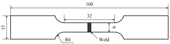 The microhardness of the weld was tested using an MH-3 microhardness tester. Five measurements were taken at different locations in the weld and the average was calculated. The plane toughness fracture test was carried out by INSTRON-1121 material testing machine with a loading force of 5 kN and a loading speed of 0.5 mm/min. Figure 2 is a schematic view showing the dimensions of the test specimen for plane fracture toughness. The test was carried out in accordance with ISO 15653:2018. The loading force is above the weld to ensure that the fracture occurs at the weld. The tensile test was carried out using an MIS8/0.22M electro-hydraulic servo tensile testing machine; the tensile speed was 1 mm/min. The size of tensile specimen is shown in Figure 3.