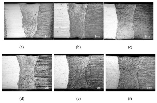 Figure 4. Effect of preheating on the cross-section of 42CrMo4/38MnVS6 laser welded joints: (a) without preheating; (b) 100 °C; (c) 150 °C; (d) 200 °C; (e) 250 °C; (f) 300 °C.