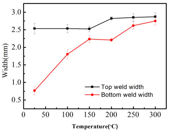 The different shapes of the cross section under 0–300 °C preheating temperature are shown in Figure 4. The profile of the cross section changed from funnel to X type when the preheating temperature increased from 0 to 300 °C. The top and bottom weld widths were larger than the middle width when the preheating temperature was over 150 °C. The top and bottom widths were plotted as a function of different preheating temperature shown in Figure 5. It can be concluded that when the preheating temperature increased to 300 °C, the bottom width increased from 0.77 to 2.75 mm, which was increased by 2.57 times compared to no preheating conditions. However, the top width increased only by 12.47% under preheating at 300 °C.