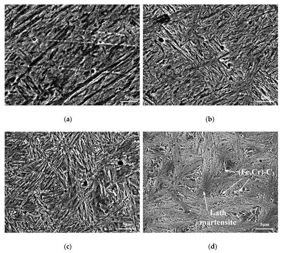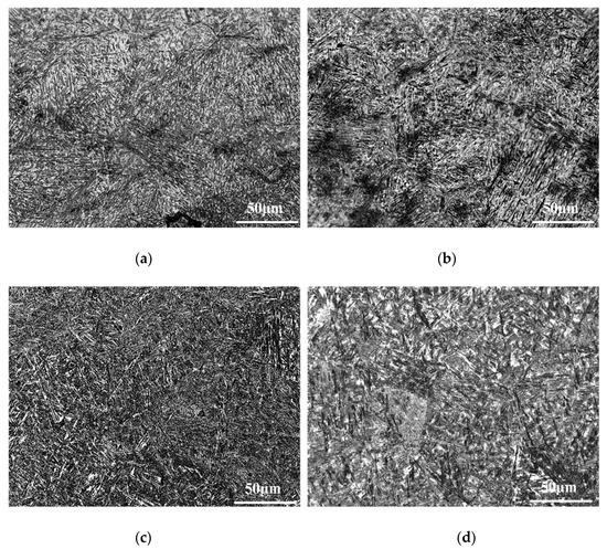 Figure 8. Martensite structure of weld zone of 42CrMo4/38MnVS6 laser welded joint: (a) single laser heat source; (b) 100 °C; (c) 200 °C; (d) 300 °C.
