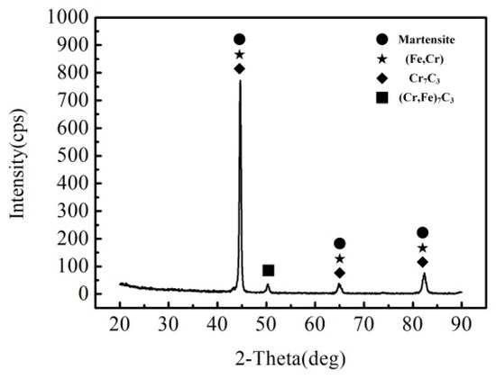 Figure 6 is the weld structure of laser welded joints without preheating and at preheating temperatures of 100 °C, 200 °C and 300 °C, respectively. The results show that the weld structure of laser welding without preheating and with preheating temperature of 100 °C is martensite. Bainite and acicular ferrite appear in the weld when the preheating temperature reaches 200 °C. When the preheating temperature reaches 300 °C, the volume of ferrite in the weld increases and becomes massive ferrite. The change of weld structure is related to the cooling rate after welding. The increase of preheating temperature decreases the cooling rate after welding. Bainite and ferrite structure begin to appear in the weld. There are differences in martensite structure in the weld zone of each joint. Figure 7 shows the XRD analysis of the weld zone at preheating temperature of 150 °C. There is no obvious difference in phase composition of weld zone under different welding conditions, which is composed of martensite, Cr7C3, and (Fe, Cr)7C3.