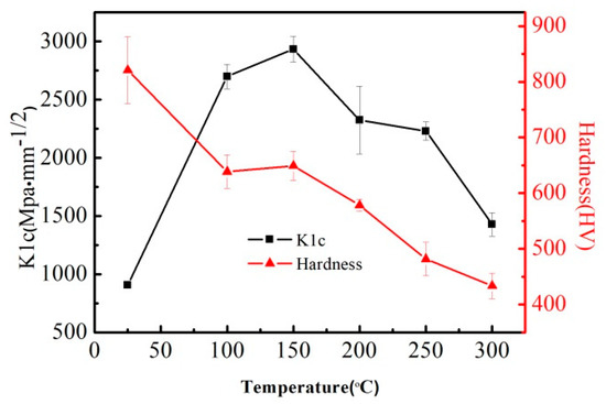 The influence of preheating on the microhardness and plane fracture toughness of the weld is shown in Figure 9. The average microhardness of the weld metal without preheating is 820.9 HV. As the temperature of preheating increases, the microhardness of the weld gradually decreases. When the preheating temperature is 300 °C, the average microhardness of the weld metal is reduced to 433.6 HV; the plane fracture toughness (K1c) of the weld without preheating is 907.67 MPa·mm−1/2. With the increase of heating temperature, the plane fracture toughness (K1c) shows a trend of rising and then decreasing: when the heating temperature is 150 °C, the plane fracture toughness (K1c) reaches the highest value of 2322.94 MPa·mm1/2. When the heating temperature is 300 °C, the plane fracture toughness (K1c) is 1427.08 MPa·mm−1/2.