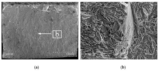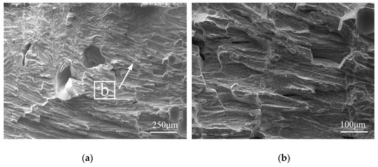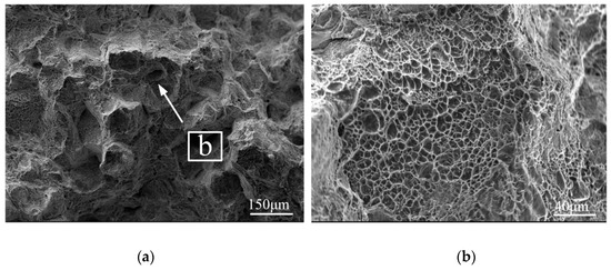 Figure 12 shows the effect of preheating on the tensile properties of welded joints. The tensile strength of the welded joint without preheating is low, and fracture occurs at the weld during tension; the tensile strength of the welded joint preheated before welding is improved. When the preheating temperature is 100–200 °C, the tensile strength of the welded joint is in the range of 1018.1–1032.5 MPa and the fracture occurred at the 38MnVS6 base metal; When the preheating temperature is from 250 °C to 300 °C, the tensile strength of the welded joint decreases. Figure 13 and Figure 14 show the tensile fracture morphology without preheating and preheating at 150 °C, respectively. As shown in Figure 13b, the fracture surface without preheating exhibits predominant brittle fracture with flat cleavage planes. As illustrated in Figure 14b, the tensile fracture contains a large number of dimples and tear ridges and the fracture mode is ductile fracture.