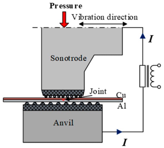 The RUSW system includes a lateral-driven high-power ultrasonic welder and an inverter resistance power supply. The current and ultrasound vibrations act on the workpiece simultaneously. In RUSW, a high pressure creates sufficient contact between the upper and lower workpieces to ensure electrical conductivity between them. The ultrasonic waves from the sonotrode pass through the upper workpiece, causing local relative vibration at the upper/lower specimen interface and thus generating friction. Resistance, friction, and plastic deformation heat cause the interface temperature to rise rapidly, resulting in solid-state joining. Figure 1 shows the schematic diagram of the RUSW process.