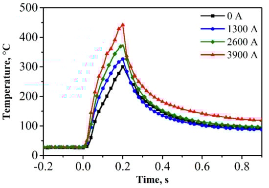 Figure 4 shows the measured temperature as the current changes from 0 to 3900 A. The results show that at the same welding time of 0.2 s, the measured peak temperature at the welding interface in RUSW is 445 °C, which is significantly higher than the interface temperature of 301 °C in conventional HPUSW. The peak temperatures with a current of 1300 A, 2600 A, and 3900 A at the welding time of 0.2 s are 328 °C, 380 °C, and 445 °C, respectively. This means that the temperature rises at a high gradient as the welding current increases, because the resistance heat QRSW has a quadratic relationship with the electric current, according to Equation (3). The higher interface temperature benefits interfacial diffusion, resulting in higher welding strength.