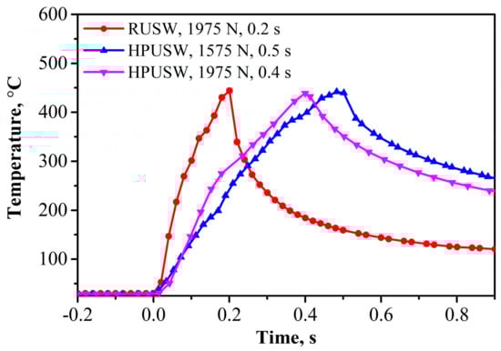 Figure 5 shows the values of the interface temperature during hybrid welding and conventional HPUSW, at different welding moments. It is evident that the peak interface temperature in hybrid welding is similar to that in conventional HPUSW under the same conditions (welding time of 0.4 s, clamping force of 1975 N, welding time of 0.5 s, and welding pressure of 1575 N). This demonstrates that the additional resistance heat can speed up the HPUSW process.