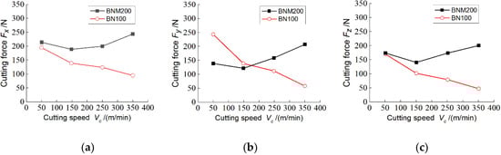 Effect of cutting speed on cutting force: (a) Radial force; (b) Force in feed direction; (c) Axial force.