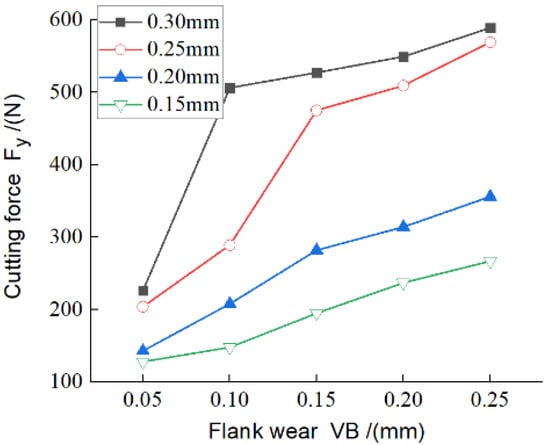 The rake face and the flank face of the cutting tool were observed for a period, and the milling forces were measured when the flank wear was 0.05 mm, 0.10 mm, 0.15 mm, 0.20 mm, and 0.25 mm, respectively. The effects of chamfer width and wear on the feed cutting force are shown in Figure 4. The feed cutting force increased with increasing width of the chamfer. Although the chamfering edge enhances the ability of the tool to resist the intermittent impact and reduces the damage probability of the tool, the cutting force tends to increase as the tool wear increases. It will increase the possibility of causing damage to the next insert. Therefore, for the intermittent milling of hardening steel with PCBN tools, the chamfer width of the tool should be selected within a range of more than 0.10 mm to less than 0.25 mm to prevent unnecessary failure.