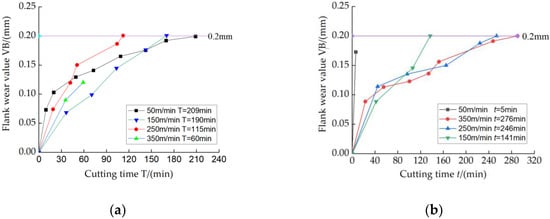 Influence of cutting speed on tool wear: (a) Tool wear of cemented carbide tools (BNM 200); (b) Tool wear of polycrystalline cubic boron nitride (PCBN) cutting tools (BN 100).