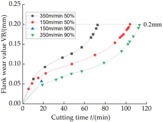 Many methods are used to improve tool performance. Luo [] changed the multi-axis milling strategy based on shifting the active cutting edge to average the wear of the cutting edge on the cutter, thus prolonging the tool life. Changing the lubrication method can also increase the tool life. The comprised dry, wet, and minimum quantity lubrication (MQL) method was identified as the best cooling method for minimum tool wear and surface roughness []. Moreover, the fluid’s content used in MQL has an influence on the chip morphology and tool performance []. In addition, changing tool materials is the most important way to improve tool performance. Polycrystalline cubic boron nitride (PCBN) cutting tools are the preferred tool material due to excellent mechanical properties of higher hardness strength and wear resistance than other tool materials at high temperature. They are frequently used in the turning of hard and wear-resistant materials, such as hardened steels, superalloy, and even ceramics [,,,]. Numerous studies investigate the machining performance and tool life in PCBN hard turning [,,]. Progressive flank wear, micro-chipping, and tool breakage easily occur due to critical crater wear []. For different cutting tools and workpiece materials, cutting speed is the main factor affecting the tool life, and it usually has a critical value after which the tool life of the cemented carbide tool will be lower than the PCBN cutting tool.