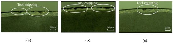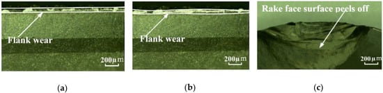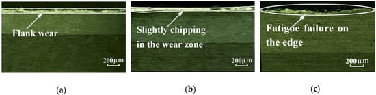 Experiments with a different cutting edge of PCBN tools (BN100) were conducted; the cutting speed was 150 m/min, and the chamfering width was 0.10 mm, 0.15 mm, 0.20 mm, 0.25 mm, and 0.30 mm, respectively. With the increase of chamfering width, the strength of the cutting-edge increased, and the damage resistance of the rake face and the flank face increases. The insert was damaged with the chamfer width of 0.10 mm after 13 min, compared with the progressive wear of the tool with the chamfer width of 0.25 mm, as shown in Figure 3. The high-brittle PCBN has poor toughness, and the milling tool needs to be chamfered, which reduces the impact of the intermittent cutting and the probability of impact damage.