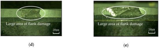 This type of damage is caused by the chipping from the edge of the tool to the flank of the tool. Generally, the chipping portion is thin on the rake face of the tool, and a large damaged surface is left on the flank face. When machining hardened steel materials with PCBN tools, this low-speed chipping often occurs during processing due to the high strength and hardness of the workpiece and the brittleness of the tool material of the PCBN tool itself. Figure 7 shows the failure mode of the five inserts in the tests at the cutting speed of 150 m/min. The 1#, 2#, and 3# inserts showed a phenomenon of edge chipping after short cutting times, as shown in Figure 7a–c. When the 4# insert cut for 26 min, no visible chipping phenomenon was found. However, a large area on the flank face was found to be damaged after 2 min, as shown in Figure 7d. For the 5# insert, no obvious tool breakage or chipping was observed after cutting 22 min. However, after 2 min, the same phenomenon appeared as with the 4# insert; that is, the flank face showed considerable damage.