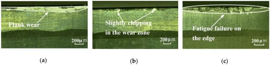 Under high-speed conditions, the failure modes are (1) flank wear; (2) material peeling on the flank surface; (3) high-speed fatigue damage on the flank surface. The element composition of the flank wear area was detected by EDX to analyze the wear mechanism. It was found that the presence of Fe, Mn, Al, and Cr elements were detected in the flank wear region of the tool, and a large number of O elements were detected as shown in Figure 12b,c. It is indicated that in the hardened steel for milling, in addition to mechanical wear, the flank was accompanied by diffusion wear and oxidative wear.