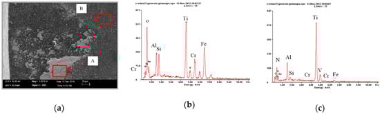 PCBN cutting tool flank wear morphology: (a) The microstructure of the flank wear; (b) Analysis of element content at A; (c) Analysis of element content at B.