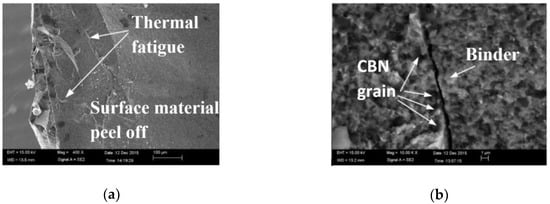 The rake surface of the PCBN tool peeled off, as shown in Figure 13, and the occurrence of fatigue cracks was clearly found in the peel-off area. The fractured form of PCBN tool was mainly along the crystal fracture, accompanied by a small amount of trans-granular fracturing. CBN grains were distributed on both sides of the crack, which was the initial crack form of crack formation. Under the action of alternating load and alternating heat, the crack expanded along the grain boundary and the binder phase. The tool was subjected to alternant load while milling, and under the action of alternating thermal load, the thermal expansion coefficients of CBN grains and binder in the tool material were different, resulting in different deformation rates and different deformation amounts. This caused that the cracks to first appear in the weaker areas (along the crystal crack), and the effect of the alternating force load further accelerated the crack propagation, resulting in fatigue damage on the rake face in the form of peeling of the surface material of the previous flank. Milling of PCBN tools under high-speed conditions, in addition to the occurrence of flank wear after the appearance of the flank, peeling on the rake face and massive area damage on the flank face may happen due to the combination of mechanical stress and thermal stress.