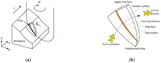 Schematic diagram of the milling process: (a) Milling of Inclined Plane; (b) Schematic of chip shape.