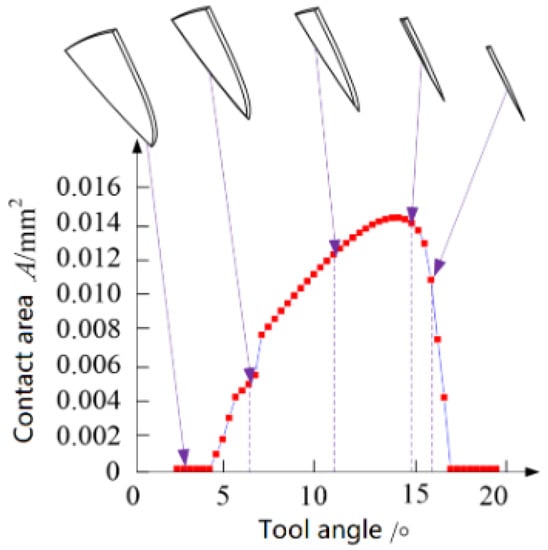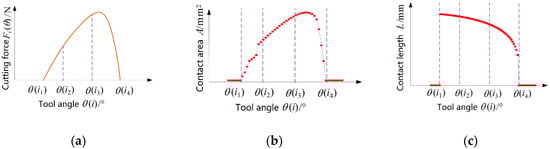 where θ is the angle of the tool turns. When the angle of the tool is θ at time i, the bending stress of the tool is related to milling force, contact length, the contact area of the tool and the chip. And these parameters are related to the angle of the tool, cutting depth, cutting speed, cutting with, feed per tooth, tool parameters, etc., as shown in Equation (12). Where Fi(θ) is the component of milling force perpendicular to the rake face when the angle of the tool is θ. And it can be obtained by the cutting test or finite element simulation method. The length of the contact inserts Li(θ), and contact area of tool and chip Ai(θ) can be obtained using 3D modeling software. The relationship between these parameters and the tool angle are shown in Figure 19. Therefore, the values of the three corners are brought into the Equation (11) to obtain the bending stress of the tool under the angle of rotation.
