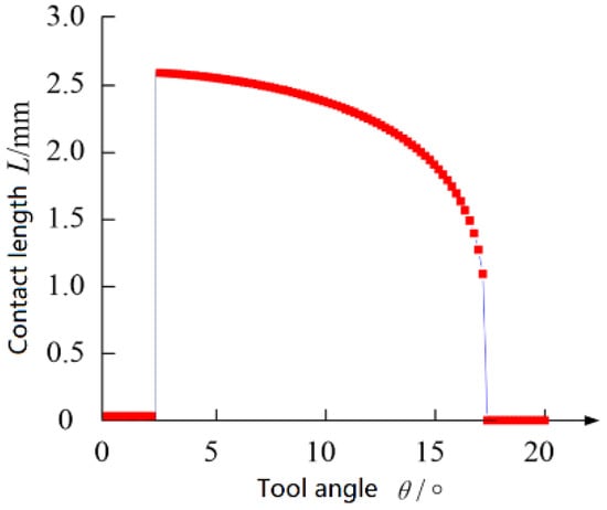 The parameters were set as the spindle speed of 7000 r/min, cutting depth of 0.3 mm, cutting width of 0.3 mm, feed per tooth of 0.1 mm/z, and inclination of the workpiece was 10°. Schematic diagram of the change of the insert-to-chip contact area at different corners of the tool is shown in Figure 15. As the tool rotated, the contact area between the tool and the chip changed continuously. The length of the cutting edge, set as L, that participated in the cutting in different tool angles under this parameter is shown in Figure 16.