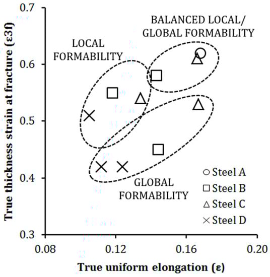 - True fracture strain values, which were used to evaluate the formability of the investigated steels, had the preferable values after an IBT temperature of 420 or 450 °C. These values were at the balanced local/global formability region of the diagram.
