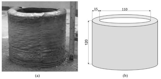 Wire arc additive manufacturing (WAAM) test sample in the form of hollow cylindrical part (a) as obtained after printing; (b) related geometrical dimension (Unit: mm).