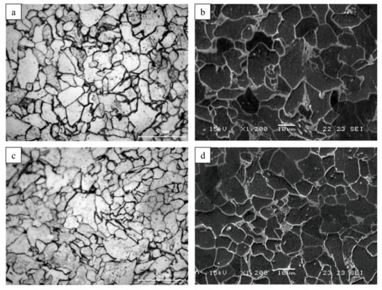 The microstructure of the printed (WAAM) alloy ER70S-6 at the transverse and longitudinal cross-sections (i.e., the XY and XZ planes, respectively) is shown in Figure 3. This revealed a typical microstructure of low carbon steel with a reduced amount of secondary pearlite phase, as obtained after an arc welding process, according to Jafarzadegan et al. []. The microstructure of the reference ST-37 alloy presented a regular ferrite matrix and a secondary pearlite phase, as shown in Figure 4. The relatively reduced amount of pearlite phase in the printed alloy was mainly the result of the inherent rapid solidification characteristics of the WAAM process, as well as the small differences in carbon content. In addition, it should be indicated that a minor amount of retain austenite was imbedded in the ferrite matrix in both alloys as expected. In terms of porosity, both alloys showed relatively similar amounts of porosity defects.