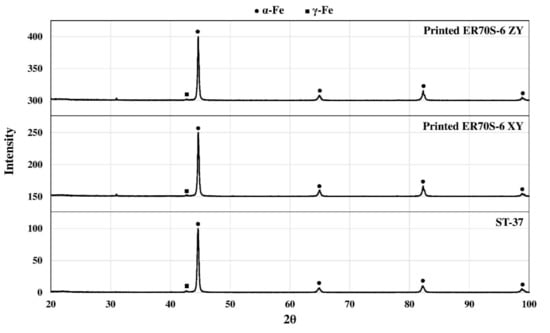 X-ray diffraction analysis of the printed ER70S-6 alloy and its reference ST-37 alloy is shown in Figure 5. This revealed that both alloys are mainly composed of a α-Fe (BCC) matrix, together with relatively small amounts of a retained austenitic phase γ-Fe (FCC). The calculated lattice parameter of α-Fe was 2.87 Å which comes in line with the literature value of 2.8664 Å (ICDD 006-0696). In addition, the diffraction patterns of the printed alloy in the XY and XZ planes were very similar, indicating that the inherent epitaxial solidification nature of the additive manufacturing process in this case was relatively insignificant.