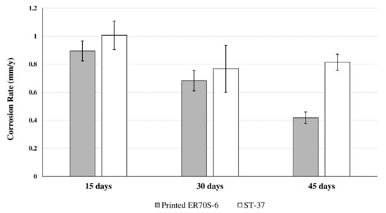 Corrosion rates of printed ER70S-6 alloy and reference ST-37 alloy after salt spray testing for up to 45 days in 3.5% NaCl solution.