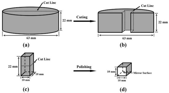 Samples preparation process. (a–c) Metallographic sample cutting process; (d) Metallographic sample polishing process.