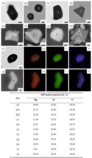 Figure 3 shows the 2D and 3D morphologies of single-particle MgAl2O4 inclusion by FESEM-EDS observation. Figure 3a–d shows the 2D morphologies of MgAl2O4 inclusion in the metallographic specimens, and these inclusion particles are long-strip, elliptical, and trapezoidal shape with a size of less than 4 μm in steel. Figure 3e–h shows the 3D morphologies of single-particle MgAl2O4 inclusion extracted from the steel specimens by the non-aqueous electrolysis method, and the 3D morphologies of MgAl2O4 inclusion particles are regular crystalline octahedron or approximate regular octahedron with a size range of 2–6 μm. Figure 3i–j shows the 2D and 3D morphologies and their elements mapping (Mg, Al, O) of MgAl2O4 inclusion and their shapes are dots and long-strip. Therefore, the 3D morphologies of MgAl2O4 inclusion indicate the obvious crystalline shape characteristics of MgAl2O4 spinel in steel that cannot be observed from their 2D morphologies.