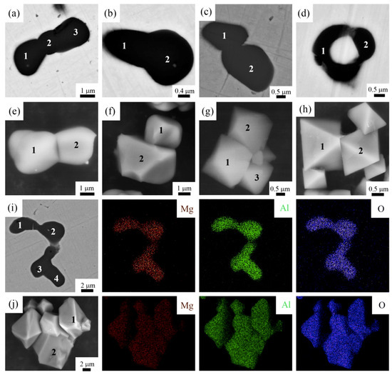 2D and 3D morphologies of single-particle MgAl2O4 inclusion. (a,c) Long-strip MgAl2O4; (b) Ellipsoidal MgAl2O4; (d) Trapezoidal MgAl2O4; (e–h) Regular crystalline octahedron MgAl2O4; (i,j) are dots and long-strip MgAl2O4 with elements mapping.