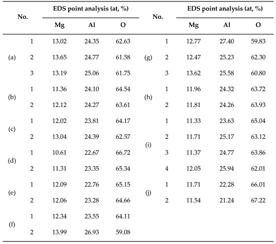 Figure 4 shows the 2D and 3D morphologies of the aggregated MgAl2O4 inclusion in steel. Figure 4a–d shows the 2D morphologies of the aggregated MgAl2O4 inclusions with an elongated and annular shape, and the sizes of these MgAl2O4 inclusions are between 3 μm and 6 μm. Figure 4e–h shows the 3D morphologies of the aggregated MgAl2O4 inclusion with different shapes (long-strip and multi-particle stacking), whose sizes range from approximately 4 μm to 6 μm. The 3D morphologies display clearly the joints and inner interfaces of the aggregated MgAl2O4 inclusion and the contact patterns. Figure 4i,j show the 2D and 3D morphologies and element mapping (Mg, Al, O) of the agglomerated MgAl2O4 inclusion, and their shape is Z-shaped and multi-particle stacking. The aggregated MgAl2O4 inclusions are approximate 14 μm in Figure 4i and 21 μm in Figure 4j, respectively. It can be seen from the elements mapping figure that the aggregated MgAl2O4 inclusion are formed by the aggregation of several small-sized MgAl2O4 particles. It can be seen from the 3D morphologies that the contact interface between the two MgAl2O4 inclusion is very obvious. The contact between them is different from the phenomenon in which the reaction causes the aggregation of inclusions, which are bonded together by different surfaces of two MgAl2O4 inclusions. It can be found from the binding sites that the two MgAl2O4 inclusions are tightly packed and there is no trace of occurrence of breakage.