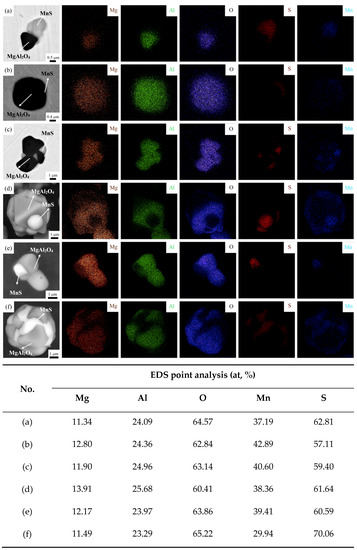 Figure 5 shows the 2D and 3D morphologies and elemental mappings of MgAl2O4-MnS inclusion in steel. Figure 5a–c shows the 2D morphologies of MgAl2O4-MnS inclusion and their elemental mappings. Figure 5a,b show the 2D morphologies of MnS embedded into the surface of the single-particle MgAl2O4 inclusion with the size of 3 μm, their shapes are upper and lower structure and spherical, while the inclusion in Figure 5c is MnS embedded into the multiple locations on the surface of the aggregated MgAl2O4 inclusion with the size of 5 μm. Figure 5d–f shows the 3D morphologies of MgAl2O4-MnS inclusion and their elemental mappings. Figure 5d shows that the MnS is embedded into the surface of a single-particle octahedral MgAl2O4 inclusion with the size of 4 μm, the shape is regular octahedron MgAl2O4 with MnS. Figure 5e,f show the MnS is embedded into the surface of aggregated MgAl2O4 inclusion. The inclusion is long-strip and ellipsoidal with dimensions of 5 μm in Figure 5e and 6 μm in Figure 5f, respectively. It can be seen from the surface elemental mapping that MnS is embedded into multiple locations on the surface of the aggregated MgAl2O4 inclusion.