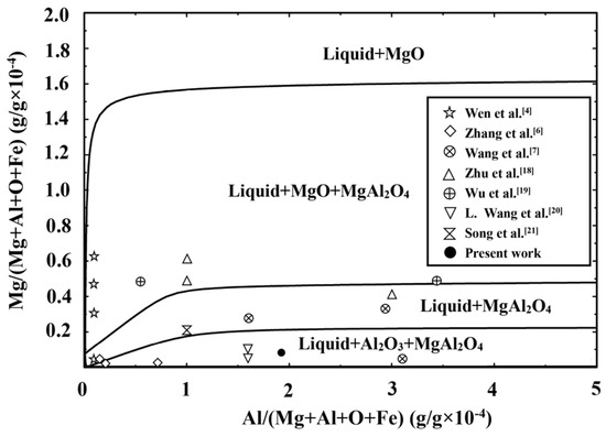 - Thermodynamic calculation shows MgAl2O4 precipitates in the liquid phase. The phase transformation follows liquid + Al2O3 + MgAl2O4 → liquid + MgAl2O4 → liquid + MgO + MgAl2O4 → liquid + MgO with the Mg content increasing when the Al content is a constant in molten steel.