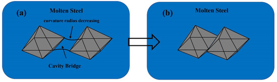 Schematic diagram of cavity bridge force. (a) Cavity bridge force formation process; (b) Aggregation of MgAl2O4 inclusion.
