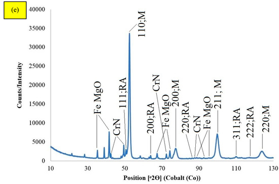 X-ray diffraction (XRD) analyses on the modified surface steels were carried out to observe the spectrum of the formation of surface layers and define its chemical composition, while using Empyrean (PANalytical) XRD (Malvern Panalytical Ltd., Malvern, UK), which was equipped with Co-Kα radiation to avoid strong effect from fluorescence of Cu radiation and achieve high resolution quantitative data. Used parameters, for example, current of 40 mA, voltage of 45 kV, recorded intensity from 2θ spectrum at angular range of 40° to 130°, and step size of 0.02.