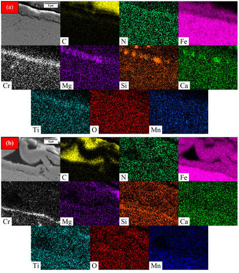 The formation of other metallic phases, such as TiN from derived TiO2 in colour pigment of ASR for ultraviolet stabiliser, was produced during nitridation process [8,9]. Recent research has shown that the presence of H2 in the system will increase the reduction rate of metallic phases and iron acted as a catalyst for the formation of various ceramic compositions. With smaller diameter of H2 atoms and highly reactive behaviour, especially with O2, thus, its presence accelerated the reduction rate of oxides [19]. Other compounds that are present in the ceramic layer are oxide phases, such as SiO2, which are highly concentrated in glass and ASR [20]. On the other hand, CaO was mainly found in slag and glass composition. Interestingly, this composite behaviour of metallic and ceramic phases have been synthetically formed during the heat treatment process. A different gradient of elements on ceramic surface to substrate of the steel was presented in SEM and EDS analysis, as demonstrated in Figure 3. EDS mapping of C, N, Fe, Cr, Mg, Si, Ca, Ti, O, and Mn elements have clearly exhibited different thickness of chemical-bonded layer into steel substrate. Further analysis on its hardness has been conducted and explained.