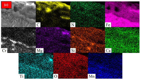 It can be observed that Cr-based layer was consistently presented underneath the Mg-based layer, in which it can act as secondary protection after Mg-based layer has been removed by applied friction force. This is due to mainly presence of Cr in steel to synthetically form Cr-based layer near the surface of steel that through selective diffusion process—exothermic reaction [17]. The composite behaviour can offer different corrosion and hardness properties of steels. Moreover, HCS-B formed a uniform and the thinnest ceramic layer that consisted of highly concentrated CrN, Mg3N2 and low concentration of TiN bonded to the steel substrate, Figure 3a. As the temperature increased, the concentration of Ca was substantially reduced due to its melting point being exceeded. Furthermore, the cavities—C element presented as resin of the mounted sample occurred at higher heat treatment temperature on the ceramic layer of HCS-C and HCS-D, as the gases remained trapped during volatilisation and gasification processes from the wastes [21]. These cavities can decrease the abrasion resistance properties of steel, as it has higher potential to wear off than the uniform characteristic of the ceramic layer on HCS-A. Despite these cavities, the thickness of super-hard ceramic was the thickest on HCS-C, as shown in Figure 3b, than all of the samples, including HCS-D in Figure 3c, in which could promote the higher-level of protection from corrosion degradation and hardness properties. However, further investigation on electrochemical and hardness properties are necessary to incorporate the microstructural analysis with chemical property results.
